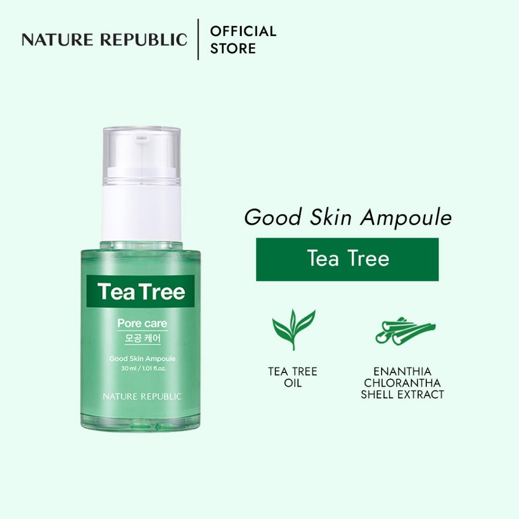 TEA TREE—This hydrating ampoule with tea tree oil balances sebum, while ceramide and floral herb extracts deeply moisturize and keep skin fresh, radiant, and non-sticky.